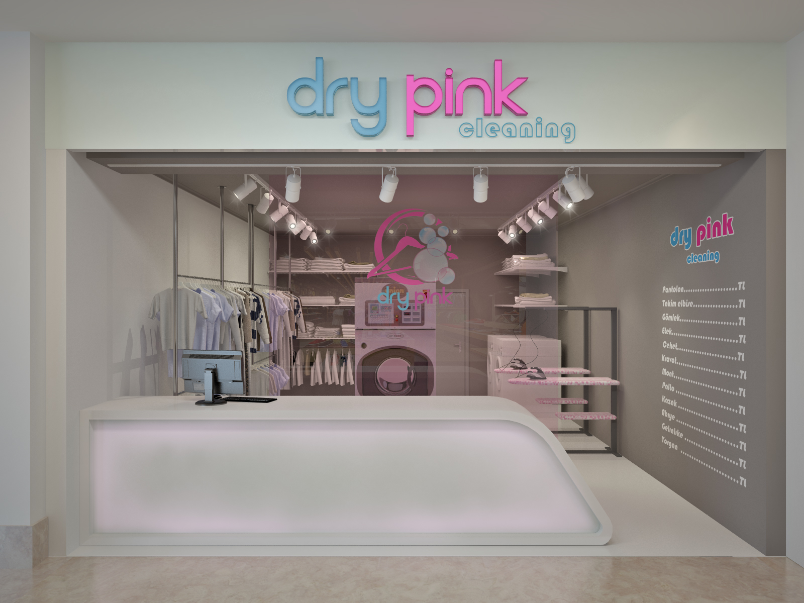 INDECO olarak, DRY PINK Kuru Temizleme mağazası için konsept tasarım ve mimari projelerin yanı sıra, anahtar teslim mimari dekorasyon ve elektromekanik uygulama işlerini gerçekleştirdik. Kullanıcı deneyimini öne çıkaran, teknik gerekliliklere tam uyumlu ve marka kimliğini yansıtan modern bir mağaza ortamı oluşturuldu.